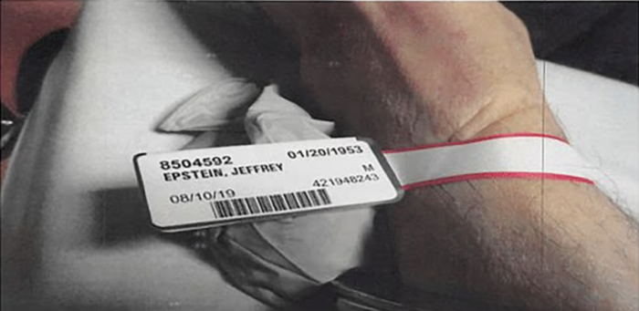 На фото: медицинская бирка на запястье Эпштейна после того, как его нашли повешенным в камере